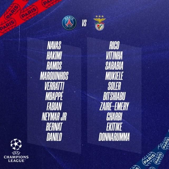 附:巴黎欧冠主场对阵本菲卡大名单