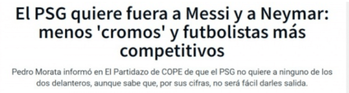来自巴黎内部的消息人士透露,新帅加尔蒂和新任总监坎波斯想要为球队打造一套全新的阵容,俱乐部想要尽快出售梅西和内马尔,但他们知道这难度很大,因为两人工资都很高。