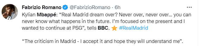 被BBC问到自己的“儿皇梦”是否已经结束时,姆巴佩说道:“不,这永远也不会结束。现在唯一确定的是我和巴黎签了三年合同,你永远不知道三年后会发生什么。”