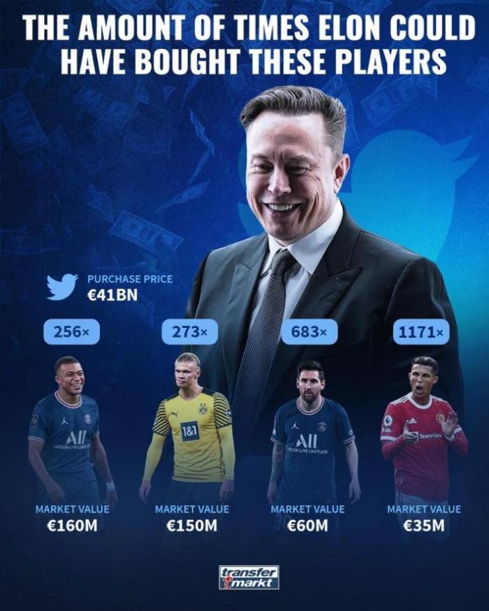 直播车04月29日讯美国科技富豪马斯克最近斥资410亿欧元收购推特,德国转会市场今日再次调侃,称410亿欧元可以买256次姆巴佩,买273次哈兰德。