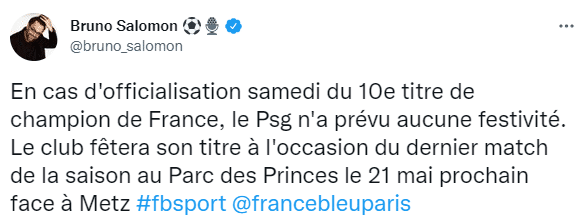 直播车04月23日讯 记者BrunoSalomon消息,虽然巴黎本轮打平就能夺取联赛冠军,但他们没有准备任何庆祝活动。