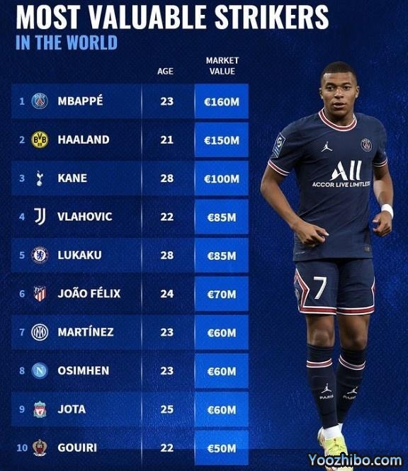 来源:直播车04-11 20:46直播车04月11日讯 德国转会市场公布了前锋最新身价榜,巴黎圣日耳曼前锋姆巴佩以1.6亿欧元居首。