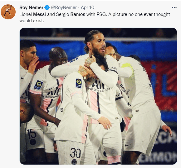 在巴黎6-1横扫克莱蒙的比赛中,梅西上演助攻帽子戏法。拉莫斯和队友庆祝进球时,把助攻的梅西搂在了怀里,Nemer写道:“这一幕此前没人敢想!”