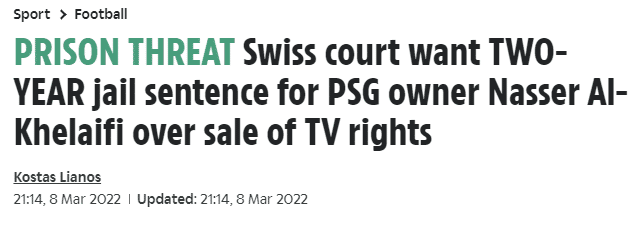 直播车03月10日讯 《巴黎人报》消息,瑞士法庭以腐败罪起诉巴黎圣日耳曼主席纳赛尔,要求他入狱28个月。