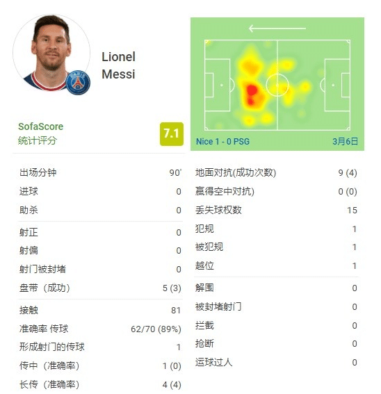 直播车讯3月6日讯 消息,在巴黎爆冷不敌尼斯的比赛中,梅西交出了0射门0进球0助攻和0过人的数据。