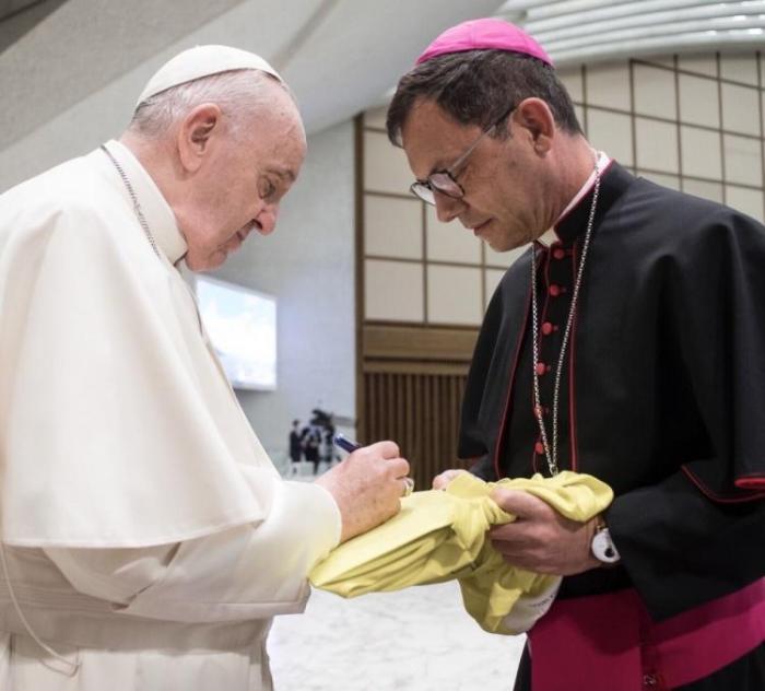E.Gobilliard写道:“今天,我向梅西赠送了一件教皇弗朗西斯亲笔签名的梵蒂冈球衣,梅西是一个有信仰的人,在收到球衣后他告诉我这对他来说很重要。”