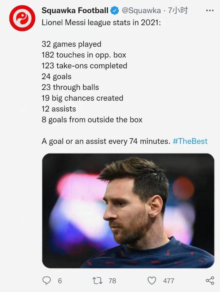 梅西2021年联赛数据:24球12助攻