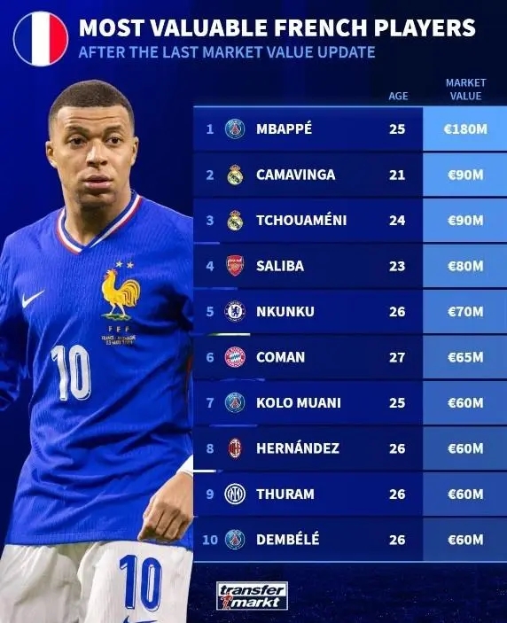 法国球员身价榜前10: