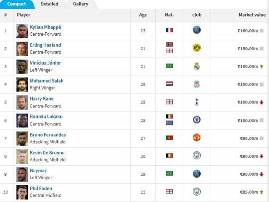德转世界足坛身价排行:姆巴佩、哈兰德前二