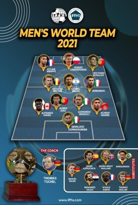 直播车12月22日讯 IFFHS(国际足球历史和统计联合会)今天公布了2021年度最佳阵容,梅西、C罗和莱万领衔,欧冠教头图赫尔担任教练。