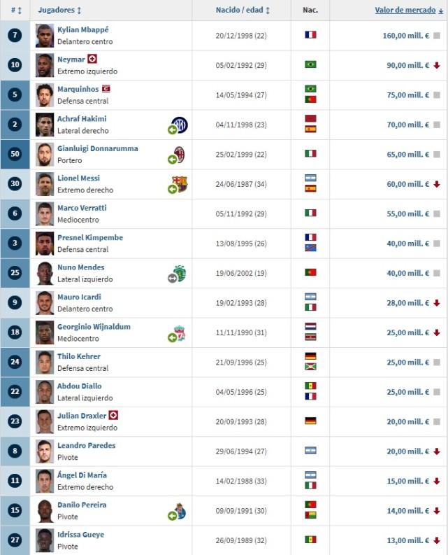 在其他大巴黎球员中,姆巴佩以1.6亿欧身价继续排名世界第一,内马尔从1.1亿欧降至9000万欧列队内第2,马尔基尼奥斯、阿什拉夫、多纳鲁马分列3-5位。