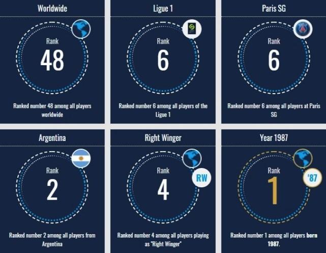 梅西的最新身价排名全世界球员第48位,法甲第6位,阿根廷球员第2位,同位置球员第4位,1987年出生的球员第1位。