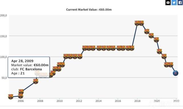 据统计,梅西的最新身价创造了自己近12年的新低。2009年4月梅西身价也为6000万欧元,不过他当时只有21岁。而梅西身价最高时刻是在2018年效力巴萨时,他的身价高达1.8亿欧元,如今仅3年时间,已经缩水了1/3。