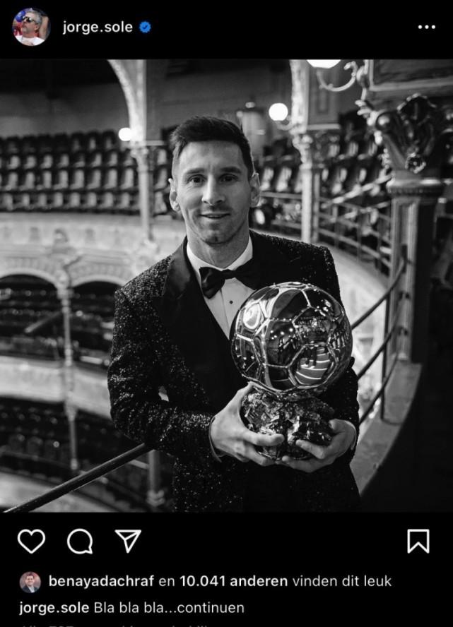 来源:直播车12-02 17:00直播车讯 北京时间12月1日晚,梅西父亲豪尔赫时隔两个月,突然在个人社交账号上更新动态。豪尔赫上传了梅西手捧金球的照片,并配文:bla bla bla...继续。而梅西父亲此举,疑似在为阿根廷巨星回击包括C罗在内的对梅西7夺金球奖的质疑声。