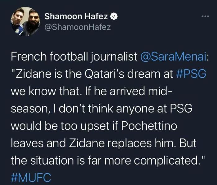 该记者表示,卡塔尔人非常希望齐达内能够执教巴黎,如果波切蒂诺在中途离开,齐达内接手的话,巴黎任何人都不会感到沮丧,然而情况要复杂得多。