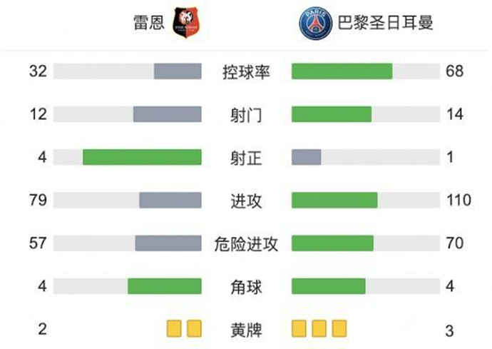 巴黎0-2雷恩 姆巴佩失良机梅西任意球中框