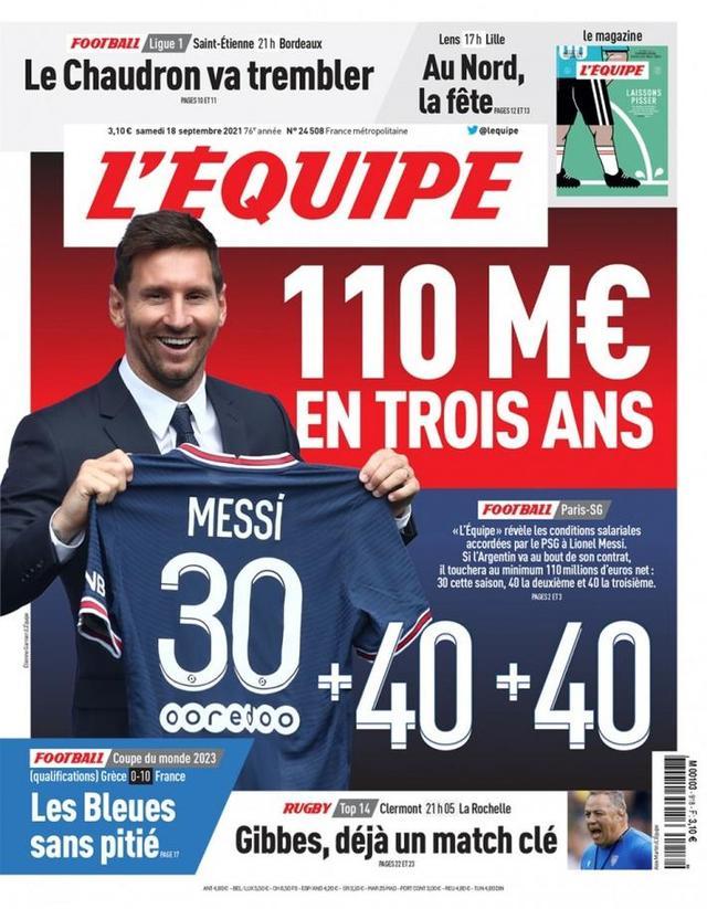 直播车9月18日讯 今日,针对梅西的薪资,《队报》今日头版曝光了相关细节,报道称,梅西的3年薪水共计至少税后1.1亿欧。
