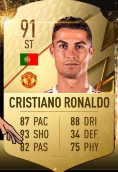 C罗的速度则为87,盘带88,射门93,防守34,传球82,身体75,总分91。