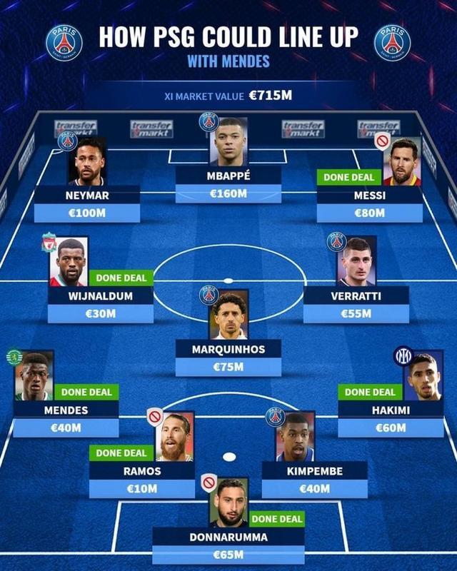 直播车9月05日讯 今日,德转列出了巴黎潜在的首发预测:梅西内马尔姆巴佩领衔锋线,首发球员总身价高达7.15亿欧。