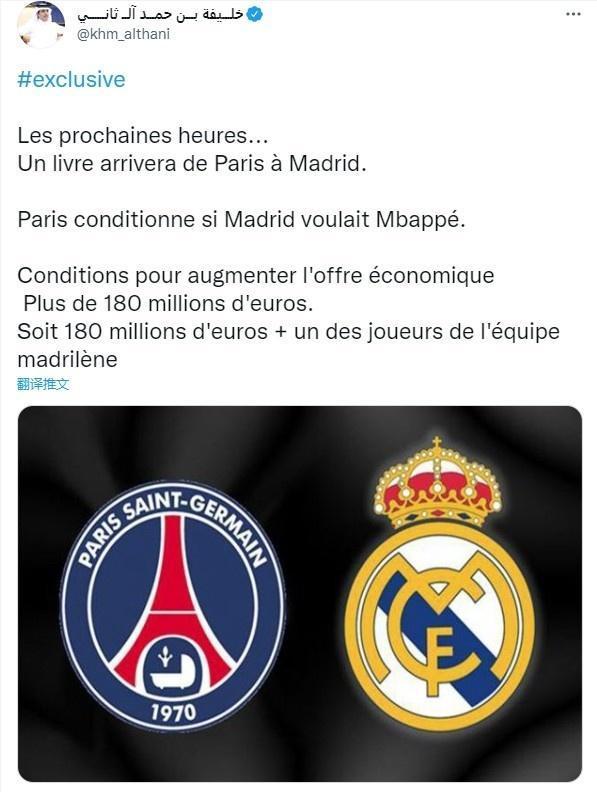 皇马对姆巴佩的第二次报价达到1.8亿欧,不过Al Thani发推称,巴黎的要价超过1.8亿欧或1.8亿加一名皇马球员。
