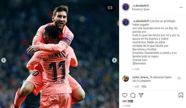 直播车讯 北京时间8月7日,巴萨球员奥斯曼-登贝莱在个人社交媒体上告别巴萨传奇球员梅西。