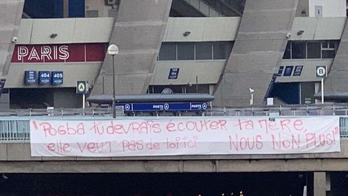 巴黎球迷在主场王子公园外悬挂横幅:“博格巴,你应该听妈妈的话,她不希望你来巴黎,我们也一样。”