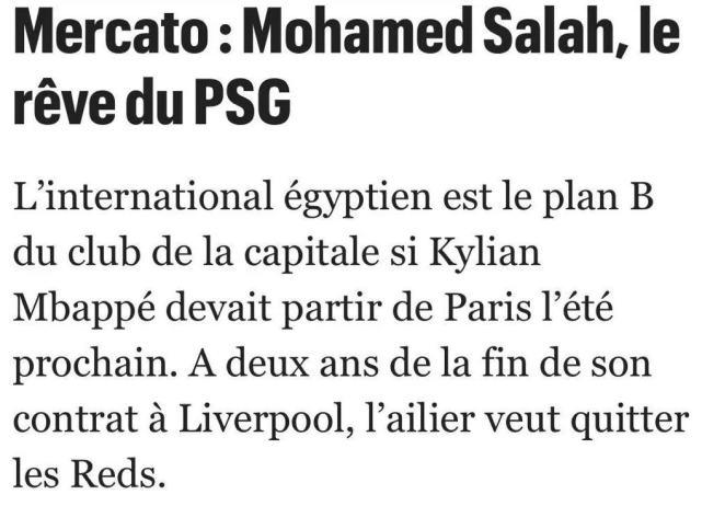 巴黎人报在一开头就表示,招募萨拉赫已经成为巴黎内部的话题,而他们也经过多方确认,证实了这一消息。与大巴黎一样,利物浦本赛季也颇为失意,球队在先后夺得欧冠和英超冠军后本赛季表现大幅下滑,利物浦目前联赛排名第七,进入下赛季欧冠的机会已经很渺茫了,因此红军也需要做出改变,克洛普可能会为了二期改造出售队内的一些王牌,萨拉赫便是其中之一。