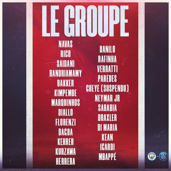 直播车讯北京时间5月3日,巴黎官方公布欧冠半决赛次回合战曼城大名单,姆巴佩、内马尔领衔。