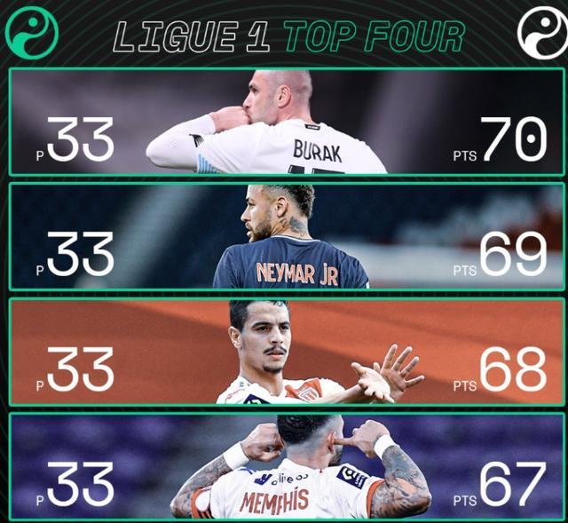 目前,法甲已经进行了33轮联赛,里尔70分排名第一,巴黎69分排名第二,摩纳哥68分排名第三,里昂67分排名第四,前四球队互相之间只差1分。