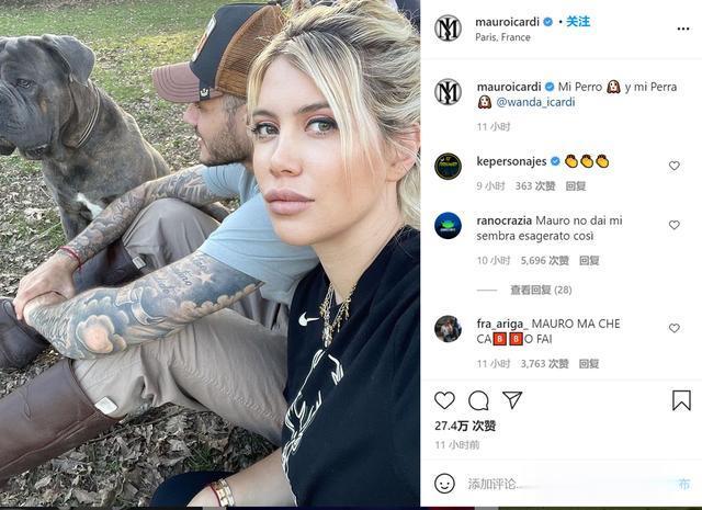 伊卡尔迪写道:“我的狗和我的母狗。”并@了自己的妻子,显然将旺达称为母狗。