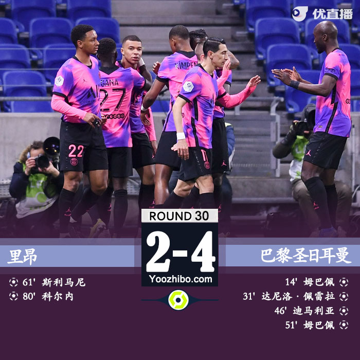 巴黎圣日耳曼4-2里昂 姆巴佩双响迪马利亚建功
