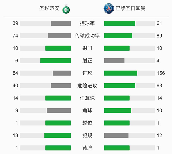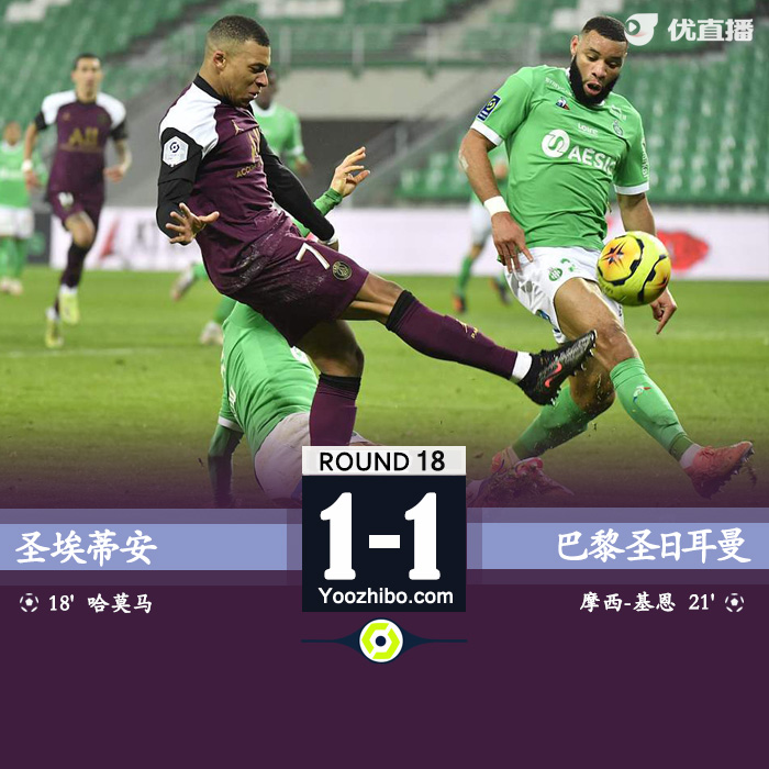 第23分钟,巴黎扳平比分,姆巴佩左路横传到门前,维拉蒂巧妙一拨,基恩转身抽射入网,圣埃蒂安1-1巴黎圣日耳曼。