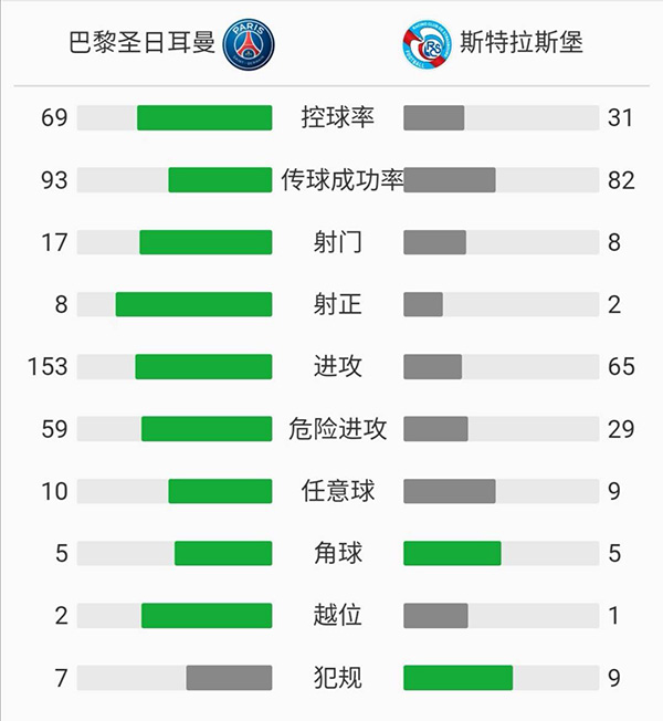 第17分钟,巴黎率先进球!迪马利亚和达格巴打出精彩配合,迪马利亚小禁区打门被扑出,彭贝尔后点补射破门,巴黎1-0斯特拉斯堡。