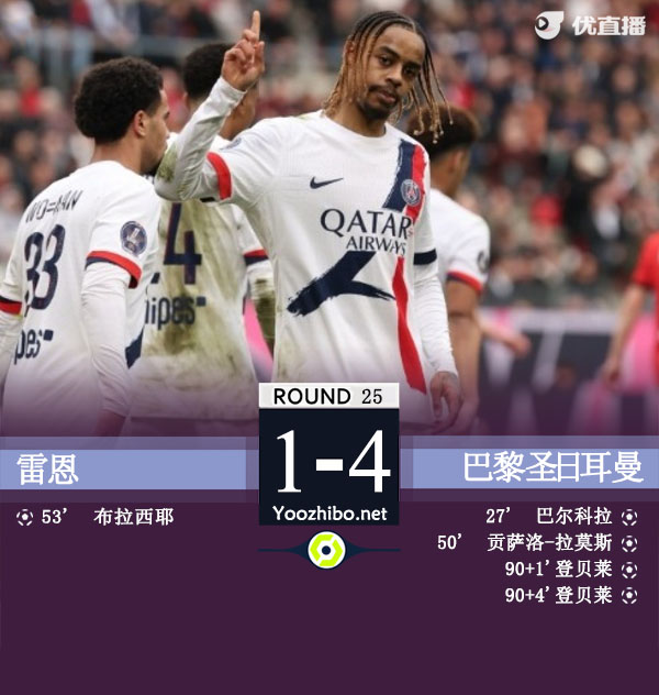 来源:直播车03-09 02:15 直播车讯 北京时间3月9日,法国足球甲级联赛第25轮,雷恩主场迎战巴黎圣日耳曼。比赛中,巴黎圣日耳曼展现了强大的攻击力,巴尔科拉和贡萨洛-拉莫斯分别为球队建功。随后,雷恩的布拉西耶成功为球队扳回一城。然而,巴黎圣日耳曼的奥斯曼-登贝莱在比赛尾声阶段梅开二度,彻底锁定胜局。最终,巴黎圣日耳曼以4比1战胜雷恩,全取三分。