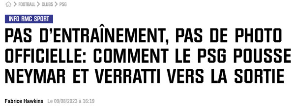 来源:直播车08-10 17:43直播车讯08月10日,来自法国知名媒体RMC的最新消息,法甲霸主巴黎圣日耳曼俱乐部已经告知内马尔、维拉蒂等5人,他们不在俱乐部一线队新赛季的计划中,大巴黎鼓励他们在这个转会窗就转会离开。大巴黎此举,大有要在今夏将“大清洗”进行到底的味道。