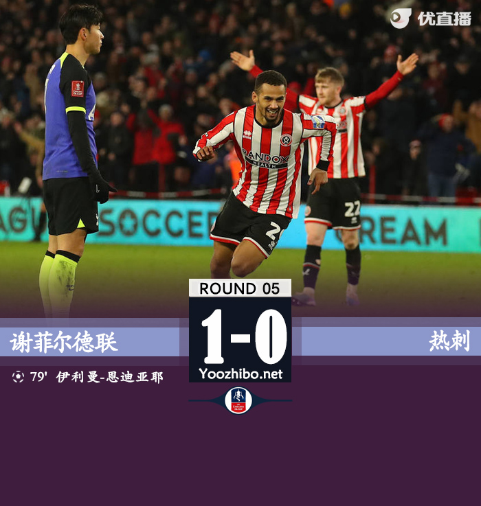 直播车讯 北京时间3月2日凌晨3:55,足总杯第五轮,热刺客场挑战谢菲尔德联。上半场,小卢卡斯击中横梁,双方互交白卷。下半场,恩迪亚耶替补破门,热刺苦攻无果!全场比赛结束,热刺0-1谢菲尔德联遭淘汰!
