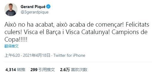 皮克写道:“还没有结束,这仅仅是个开始,祝贺大家!巴萨万岁,加泰罗尼亚万岁!国王杯冠军!”