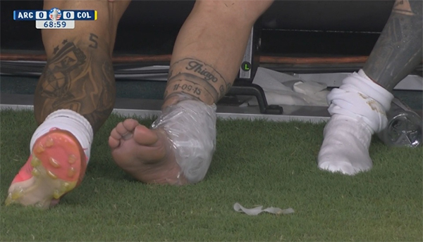 本场决赛,阿根廷遭到了哥伦比亚的顽强狙击,而梅西更是受到哥伦比亚球员的重点照顾。比赛第36分钟,梅西就在一次传中后遭到阿里亚斯踩脚踝倒地痛苦翻滚,并且一度到场外接受治疗。