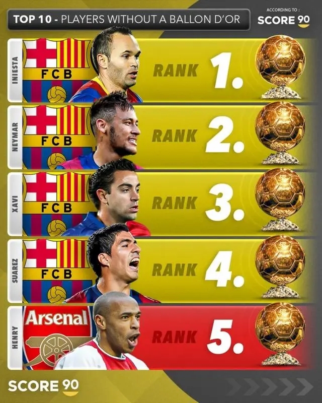 Score90:21 世纪未获金球奖球员,伊涅斯塔登顶榜首