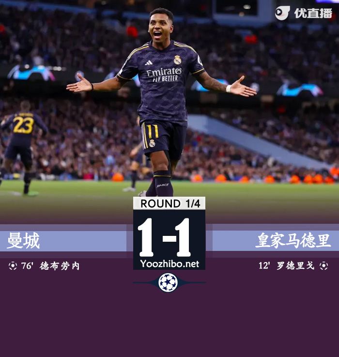 直播车讯:北京时间4月18日欧洲冠军联赛 1/4决赛次回合,曼城主场对阵皇家马德里。上半场,罗德里戈两连击破门,哈兰德头球攻门击中横梁,德布劳内远射被扑,格拉利什抽射变线偏出,德布劳内角球直奔球门被卢宁指尖扑出;下半场,格拉利什凌空斩被挡,格拉利什扣过防守抽射还是被封堵,德布劳内小角度劲射入网,德布劳内迎球推射稍稍高出;加时赛阶段,沃克精彩完成对维尼修斯的单防,吕迪格近距离打门踢偏,卡瓦哈尔出现抽筋情况被换下;点球大战阶段,卢宁两度扑点帮助球队赢下比赛。最终比分曼城 3-4 皇马。两回合总比分曼城7-8皇马。