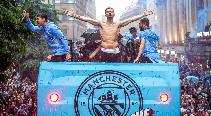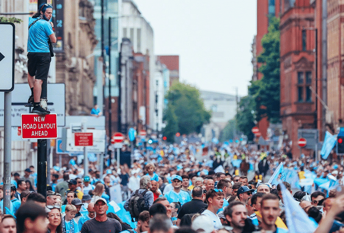 曼城三冠王游行!格拉利什抢镜,哈兰德放飞自我,瓜帅高举奖杯