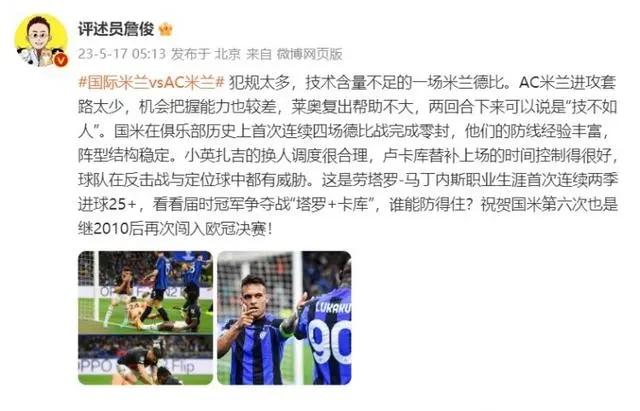 来源:直播车05-17 16:25直播车04月17日讯 3:00,欧冠半决赛次回合米兰德比,国米1-0战胜米兰,总比分3-0晋级决赛。赛后著名足球评述员詹俊发文评价了本场比赛:犯规太多,技术含量不足的一场米兰德比。