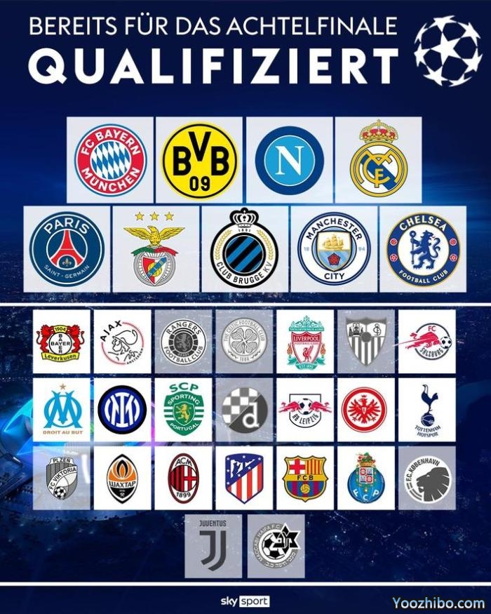切尔西巴黎圣日耳曼、多特蒙德和本菲卡本轮提前出线,加之之前的皇马曼城拜仁、那不勒斯和布鲁日,一共9支球队确定杀入16强。