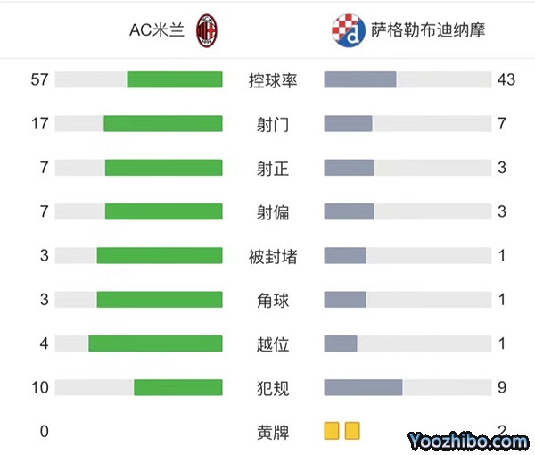 全场比赛结束,AC米兰3-1萨格勒布迪纳摩。