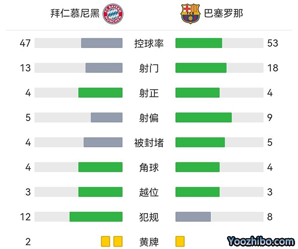 全场比赛结束,最终拜仁2-0击败巴萨。