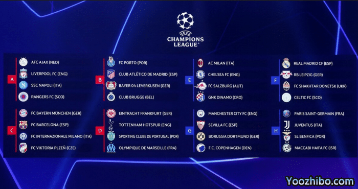 E组有AC米兰、切尔西、萨尔茨堡红牛、萨格勒布迪纳摩,切尔西和AC米兰将被看好;F组有皇马、RB莱比锡、顿涅茨克矿工、凯尔特人,皇马独一档;G组有曼城、塞维利亚、多特蒙德、哥本哈根,曼城也是独一档;H组有巴黎圣日耳曼、尤文图斯、本菲卡、海法马卡比,这组也竞争激烈,本菲卡是上赛季的欧冠8强队伍,大巴黎牌面独一档,尤文图斯将和本菲卡争一个出线名额。