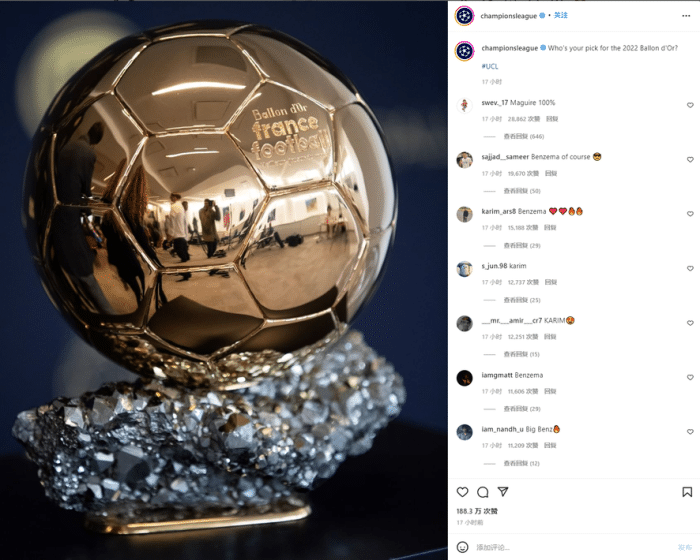 直播车05月19日讯 欧冠官方Instagram账号今天发文询问球迷谁该获得今年的金球奖,马奎尔获得了最高赞。