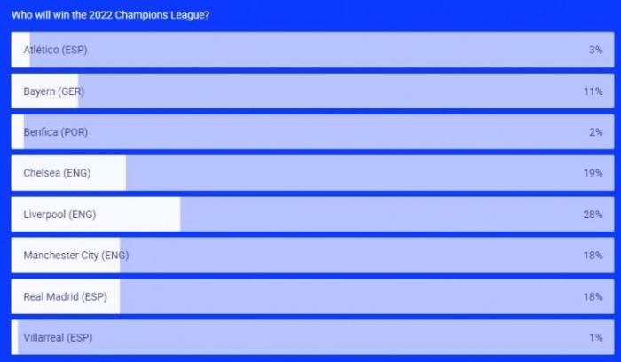 在这次投票中,利物浦获得了最高的28%的支持率,卫冕冠军切尔西以19%位居第二,曼城和皇马并列第三(18%),拜仁位居第五(11%)。