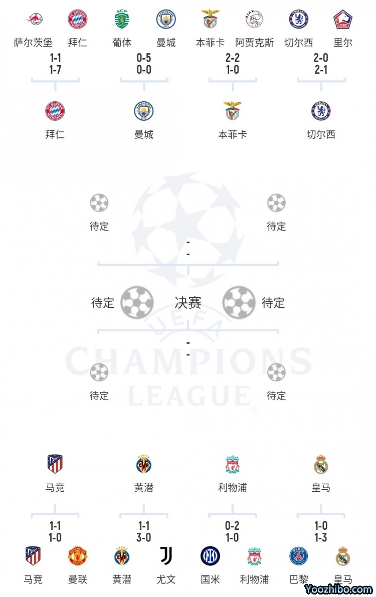 比利亚雷亚尔、切尔西、马竞、本菲卡、拜仁、利物浦、曼城、皇马。