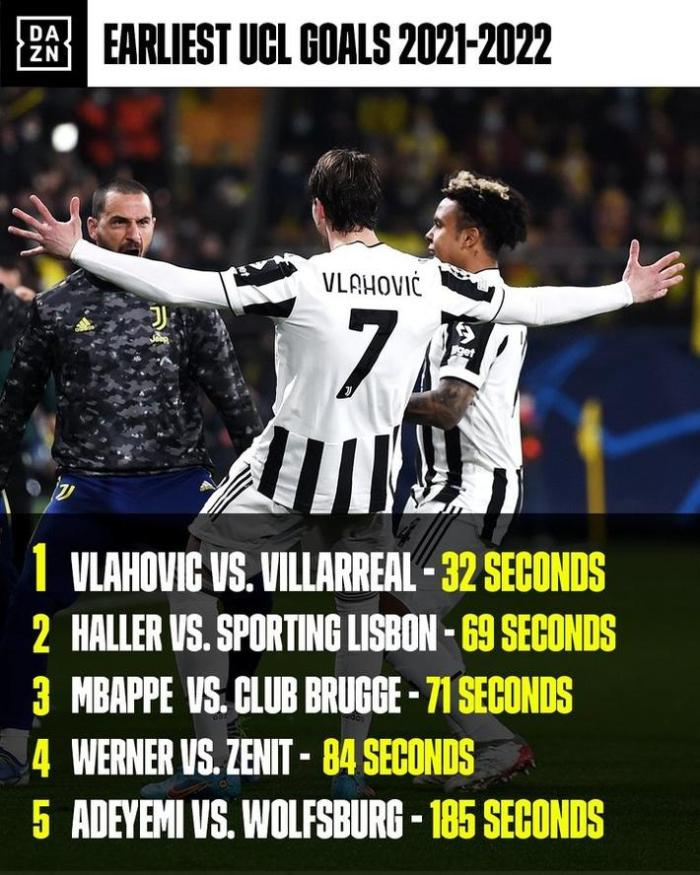 直播车02月23日讯 据DAZN数据统计,弗拉霍维奇对比利亚雷亚尔的进球是本赛季欧冠最快的进球。